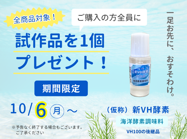 9月17日から募集しました「(仮称)新VH酵素モニター2回目」ですが、今回も大変ご好評いただき、たくさんのお喜びの声・励ましのお声をお寄せいただきました。心より感謝申し上げます。